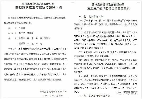 徐州鑫泰鍍鋅設備有限公司迅速成立以董事長任成斌為組長的疫情防控領導小組,制定